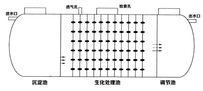 1.本設(shè)備為化糞池污水凈化一體化設(shè)備。沉淀發(fā)酵區(qū)和厭氧降解區(qū)為化糞功能區(qū),厭氧區(qū)和過濾區(qū)為凈化功能區(qū)。
